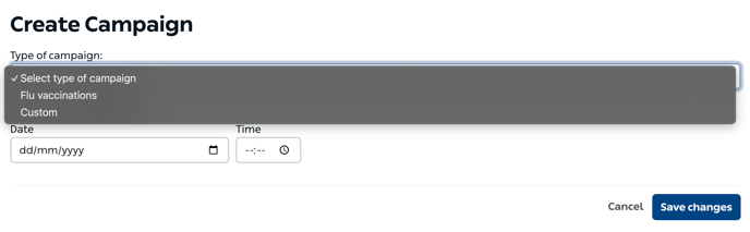- Choose the type of campaign you want to create. A Flu vaccination campaign will use standard text and link to the flu vaccination page. With a custom campaign, you can write the text yourself.
