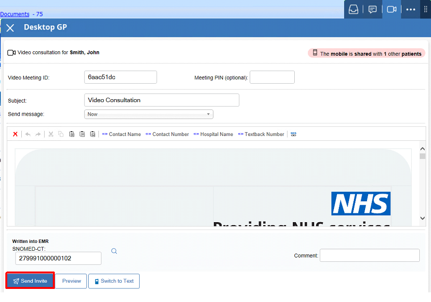 Sending a Video Consultation invite to an alternative mobile number