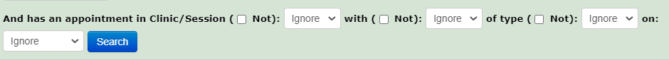 - Filter by Clinic / Session, with (clinician), type (slot type), on (day), and then click Search: