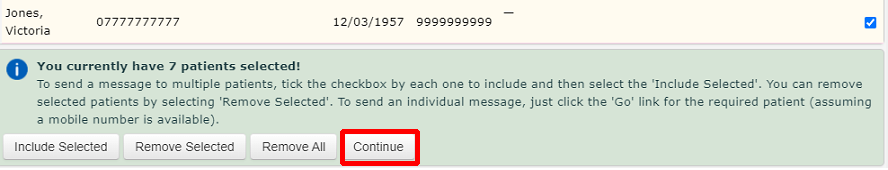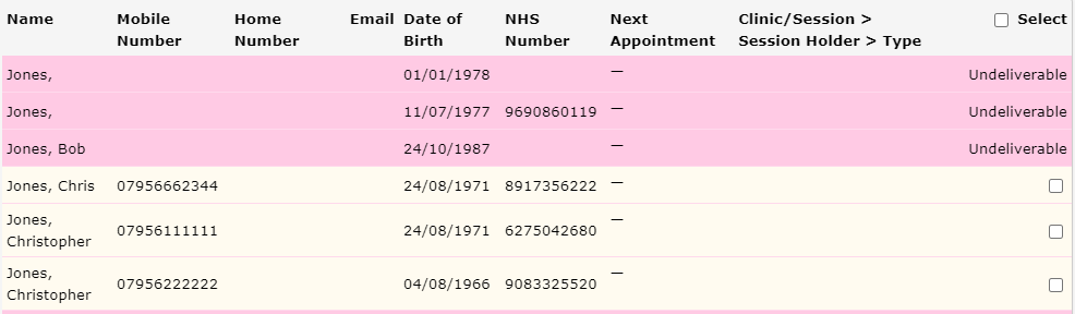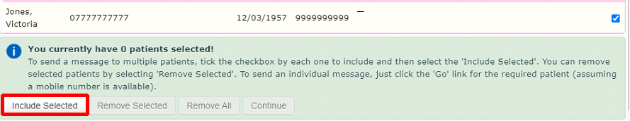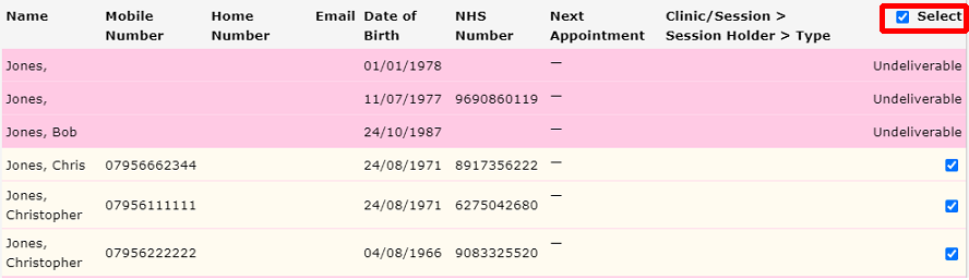 The patients that you are able to text have tick boxes next to them, and the patients that you are unable to text (i.e. no mobile number or opted out of receiving texts) are highlighted in red.