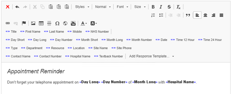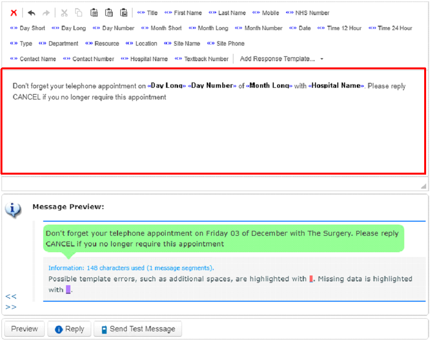 - Enter your message into the text box, using the appointment fields where appropriate: