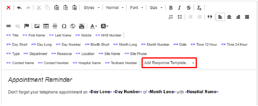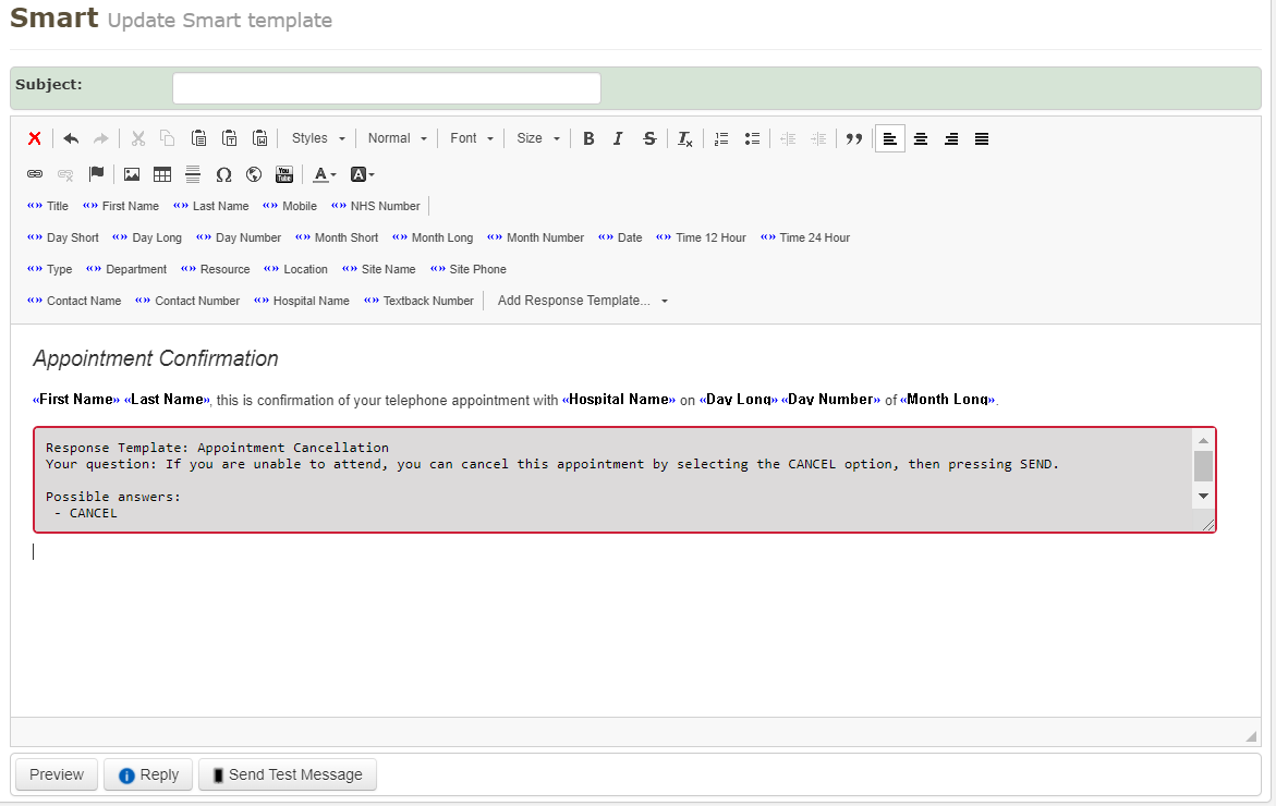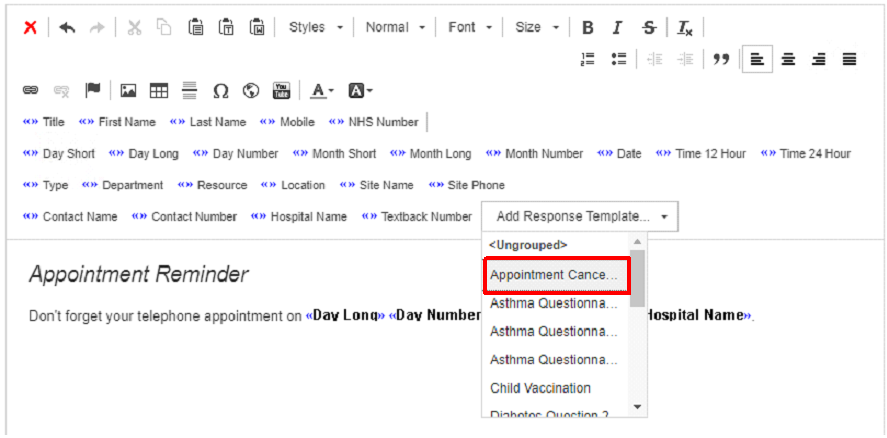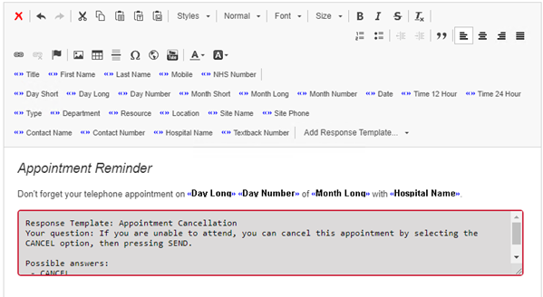 - Enter your message into the text box, using the appointment fields where appropriate, and also add the Appointment Cancellation response template: