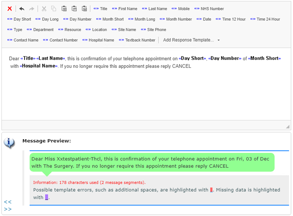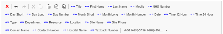 Textback Number | This inserts a 'textback number', which allows patients to reply to your reminder (if you use NHS Mail for messaging), i.e. "please text CANCEL to <<Textback Number>> if you cannot attend the appointment". |