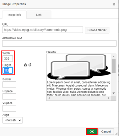 - Change the Height and Width of the image to Width: 333, and Height: 112, and then click OK: