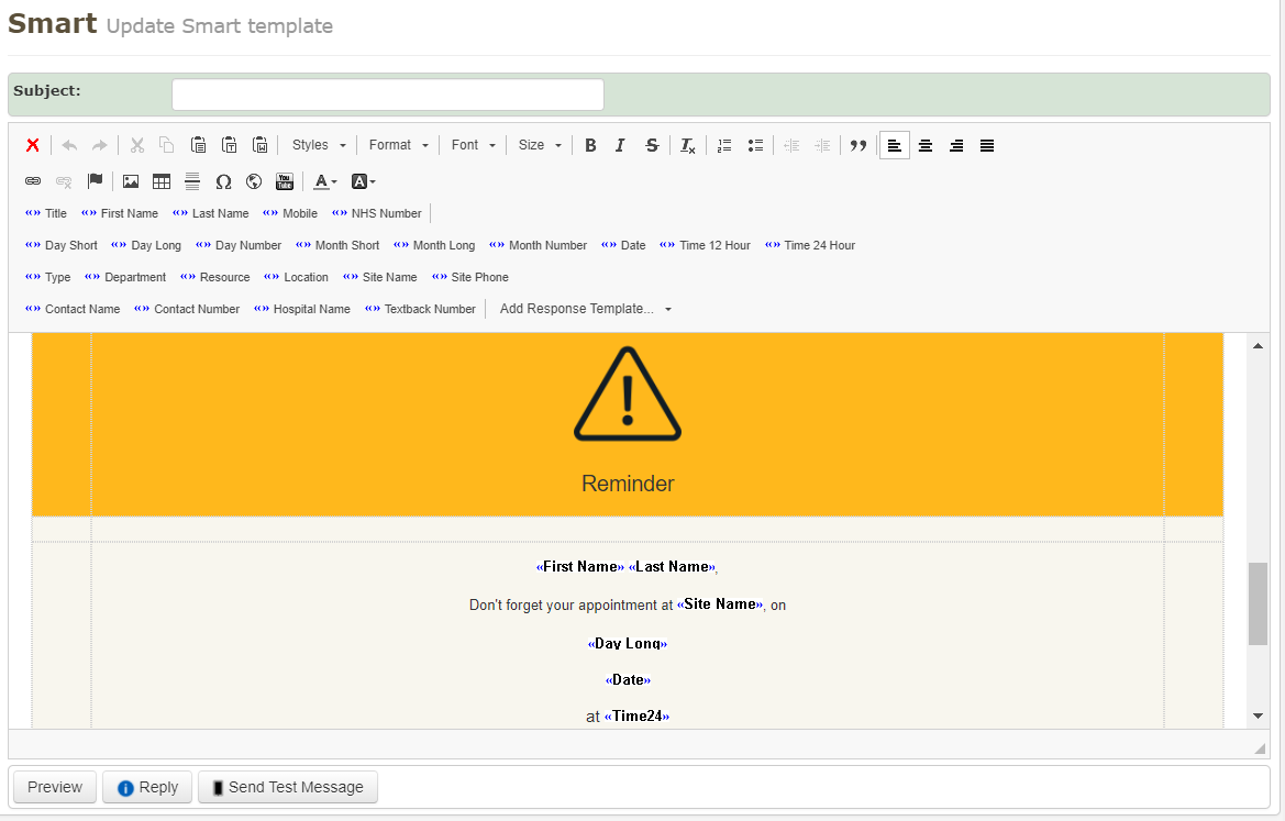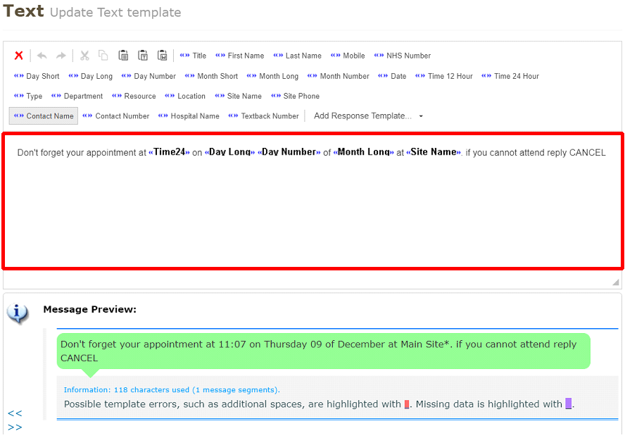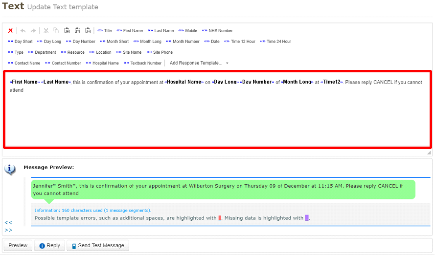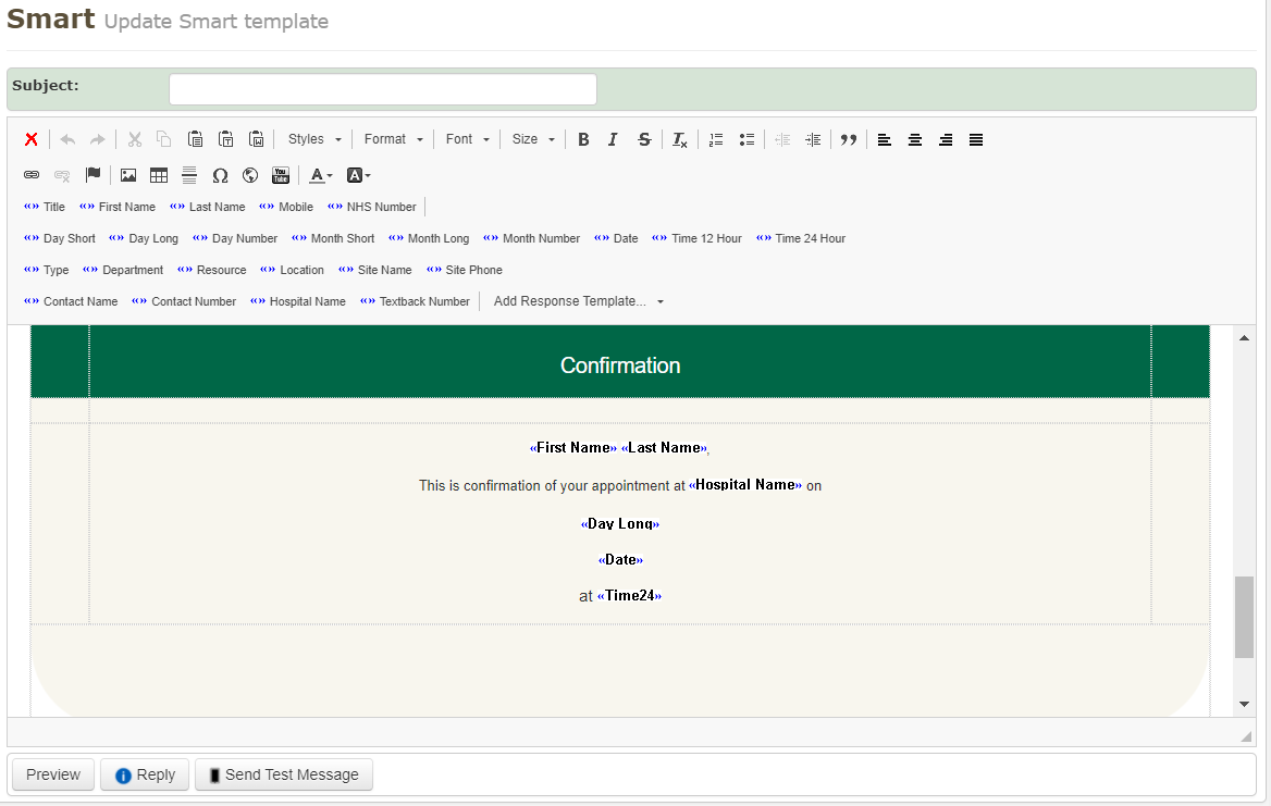 - Enter your message into the text box, using the appointment fields where appropriate:
