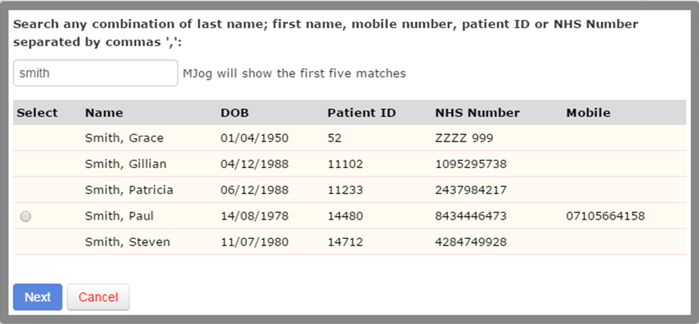 - Search for the patient you wish to contact. All patients that are opted into text and have a valid mobile number will have an option to select to the left. Select the patient, and then click Next: