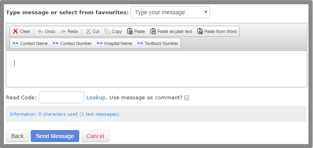 A Read / SNOMED code can be specified, which will add a read code and code term to the patient's record within your clinical system; If the Use message as comment? box is ticked, the wording of the message will also be added as a comment along with the read code and code term.