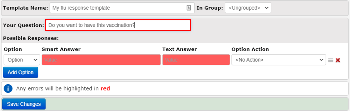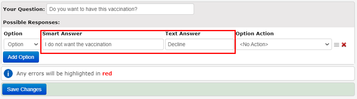 - Under Possible Responses, you will enter all the possible responses. In this example, type: I do not want the vaccination / Decline into both the Smart Answer and Text Answer boxes: