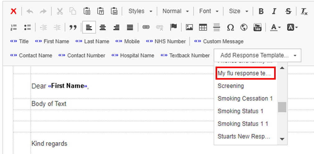 Response Templates enable your patients to respond to a message that you have sent them, i.e. to decline a flu vaccine. Adding a response template to a Smart Template also allows you to code responses received in a Now/Reply or Batch Message.