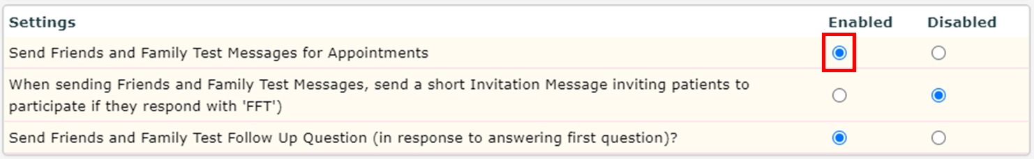 - Select the Enable option for Send Friends and Family Test Messages for Appointments: